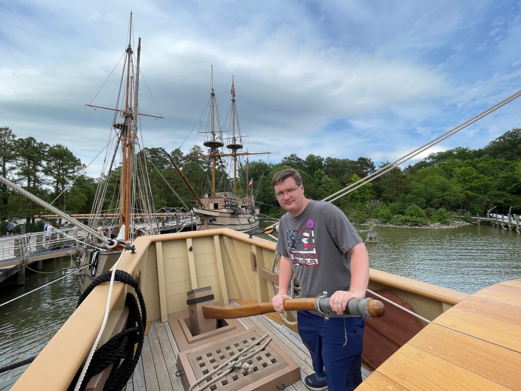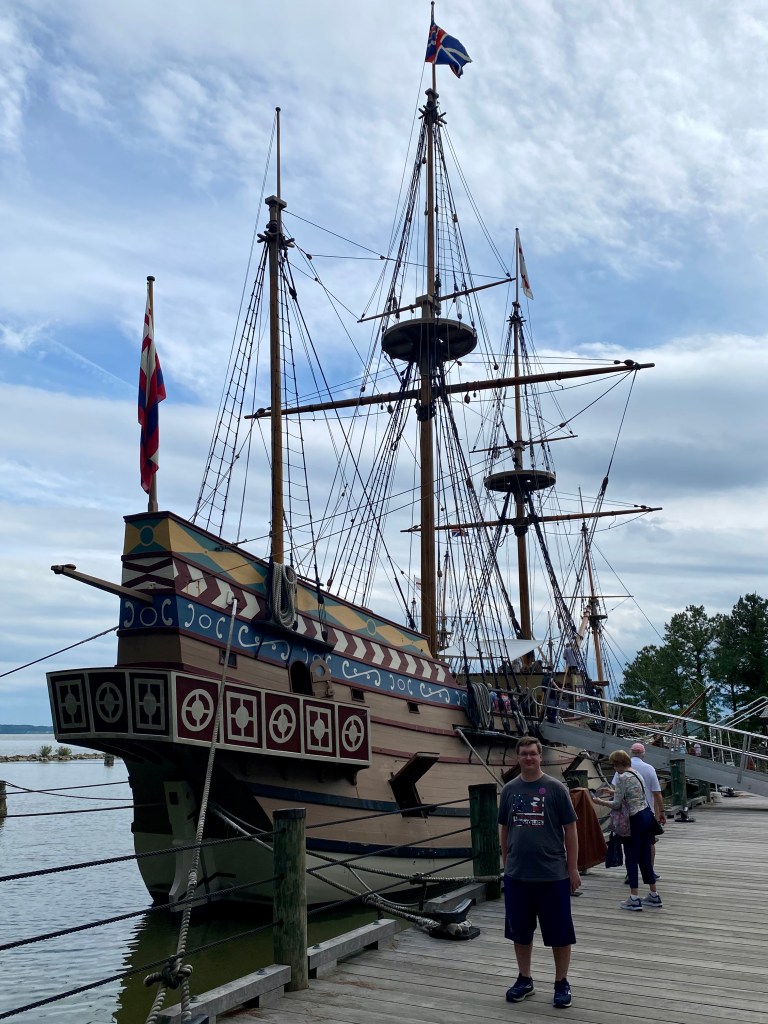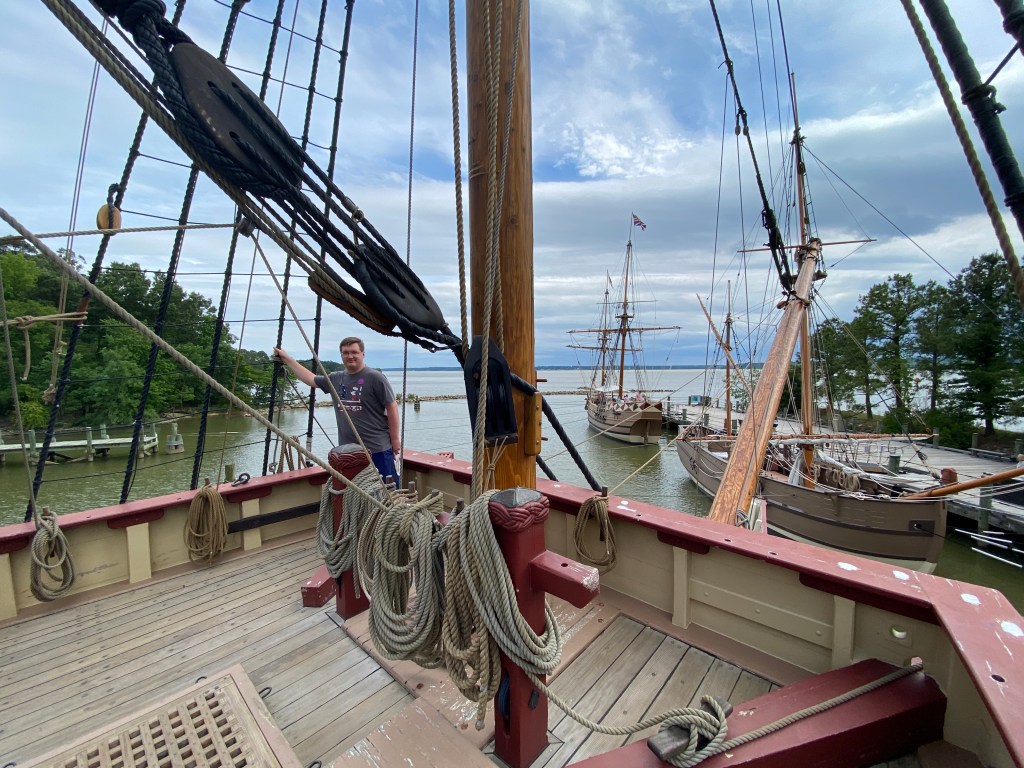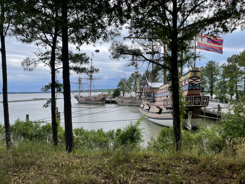 Replicas of the three ships that brought the first settlers to Jamestown are situated here, including the Godspeed (left), the Discovery (center), and the Susan Constant (right).