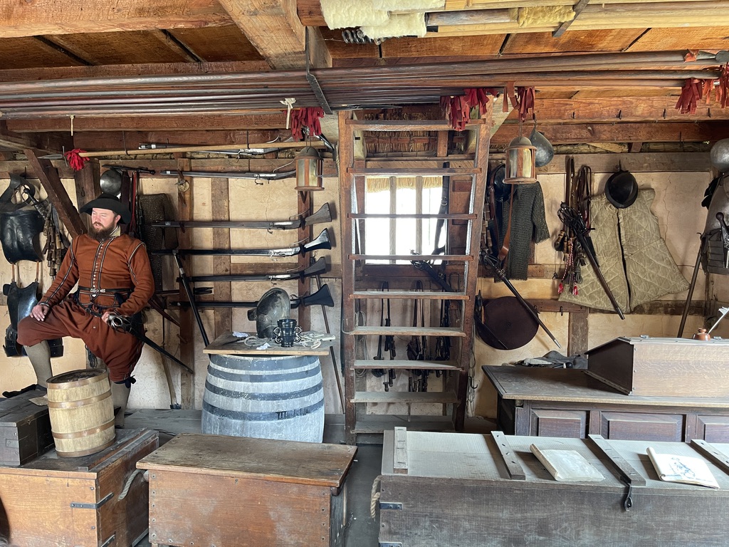 I’m only joking! It was simply an interpreter demonstrating how to fire a 17th century rifle, which is considerably more time-consuming and difficult to do than modern firearms would be. And louder too (ow).
